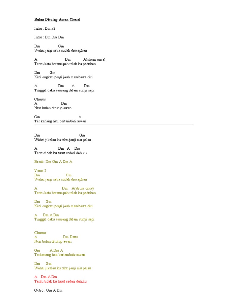 Bulan Ditutup Awan - Yuna Wahai janji setia sudah diucapkan aduh kata bersumpah telah kupadukan kini engkau pergi jauh membawa diri tinggal daku saorang dalam sunyi sepi Nun bulan ditutup awan terkenang hati. Dm x3 Dm Gm Wahai janji setia sudah diucapkan A Dm A Aduh kata bersumpah telah ku padukan Dm Gm Kini engkau pergi jauh membawa diri A Dm A Dm Tinggal daku seorang dalam sunyi sepi. Malam bulan dipagar bintang.